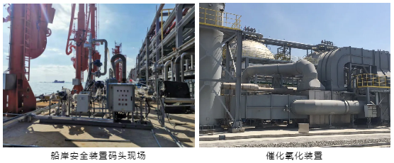產(chǎn)品罐區(qū)及碼頭裝船區(qū),油氣經(jīng)過“收集-輸送-冷凝(吸收)-催化氧化”等工藝處理,最終達標排放。
