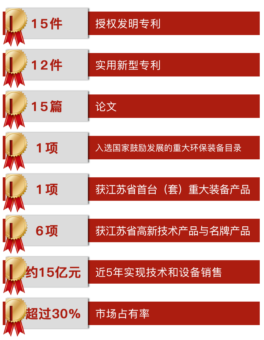 項目獲授權發明專利15件,實用新型專利12件,論文15篇,裝備入選國家鼓勵發展的重大環保裝備目錄1項,獲江蘇省首臺(套)重大裝備產品1項,獲江蘇省高新技術產品與名牌產品6項。項目近5年實現技術和設備銷售約15億元,市場占有率超過30%。